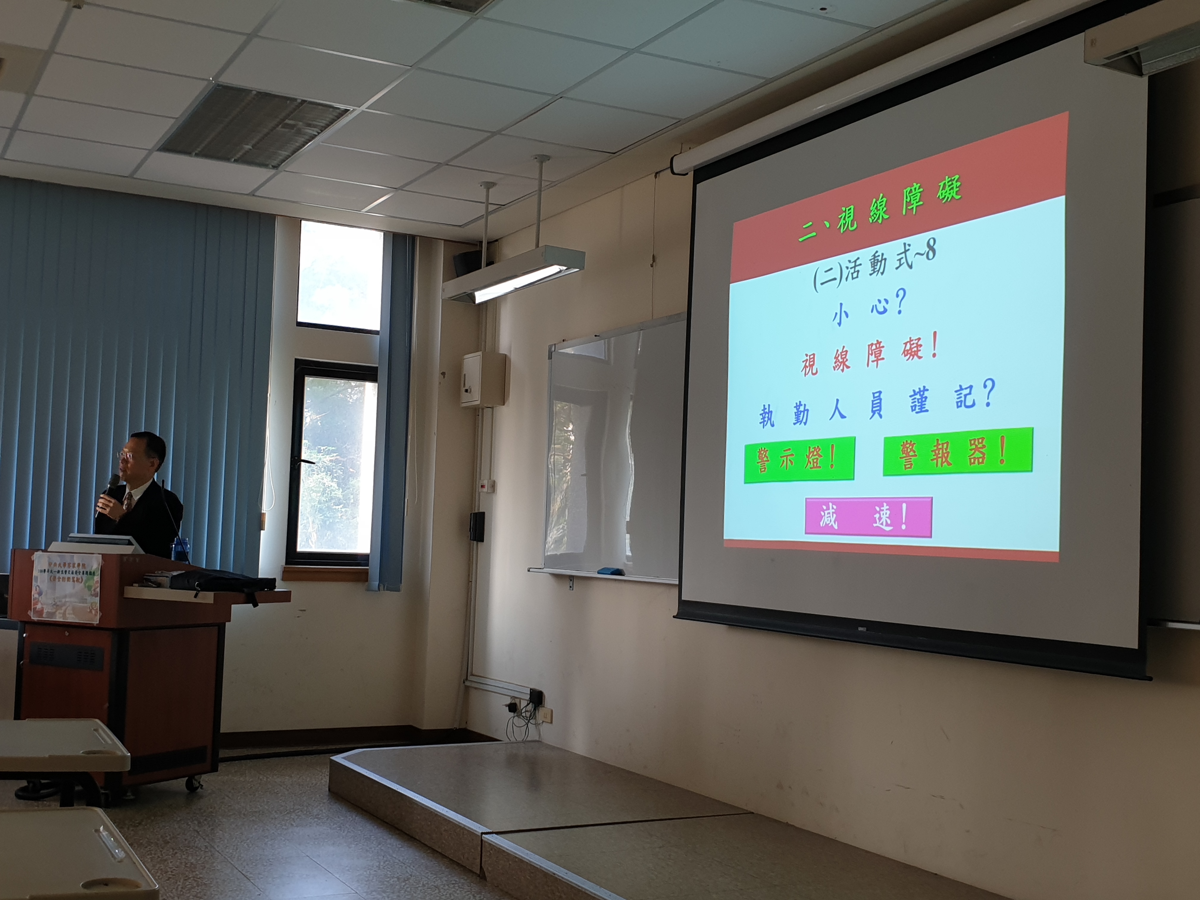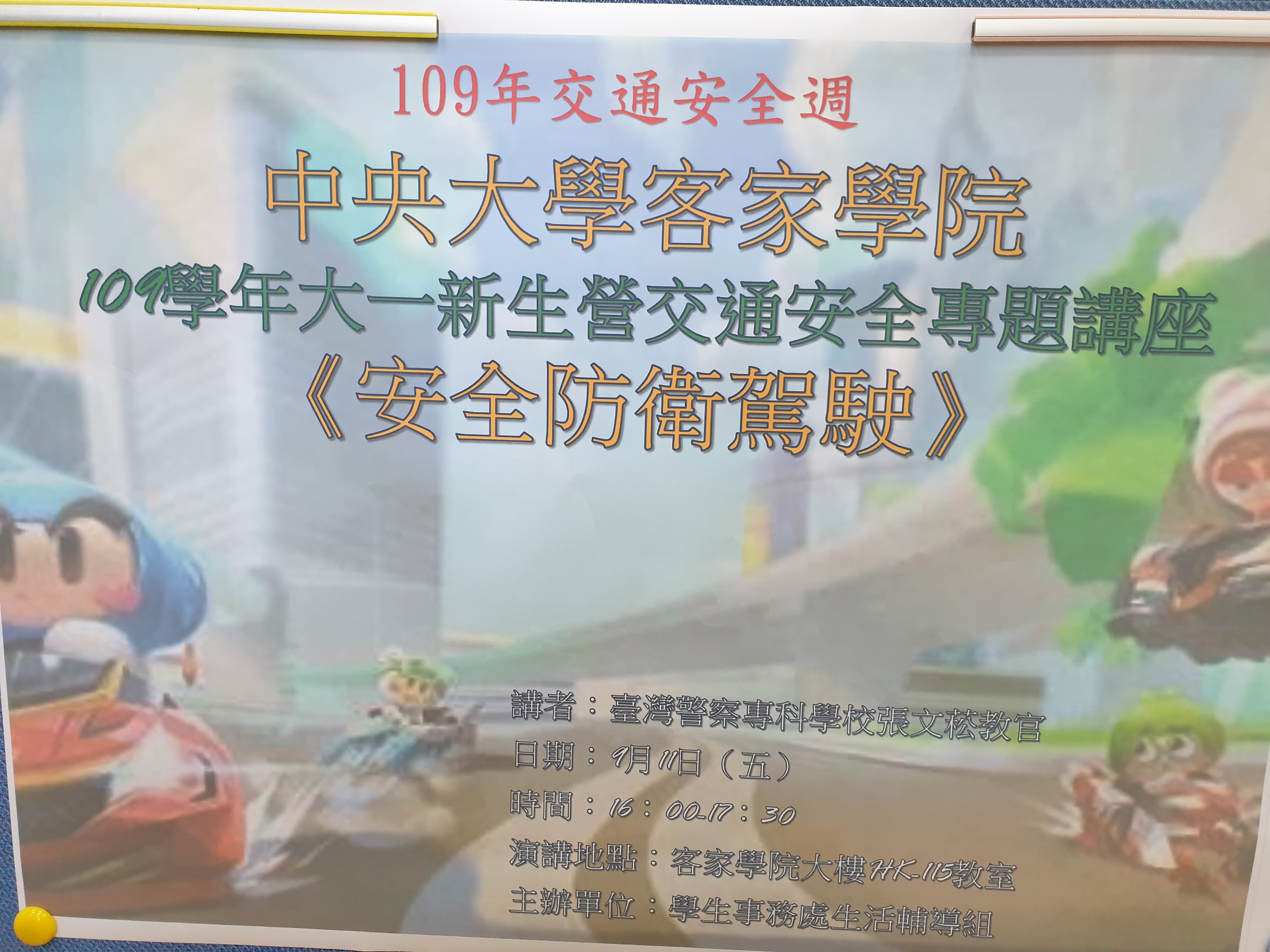 109年《交通安全週》於109年9月11日假生客家學院大一新生營活動,邀請中央警大張文菘博士實施「防衛駕駛」講座實施情形。