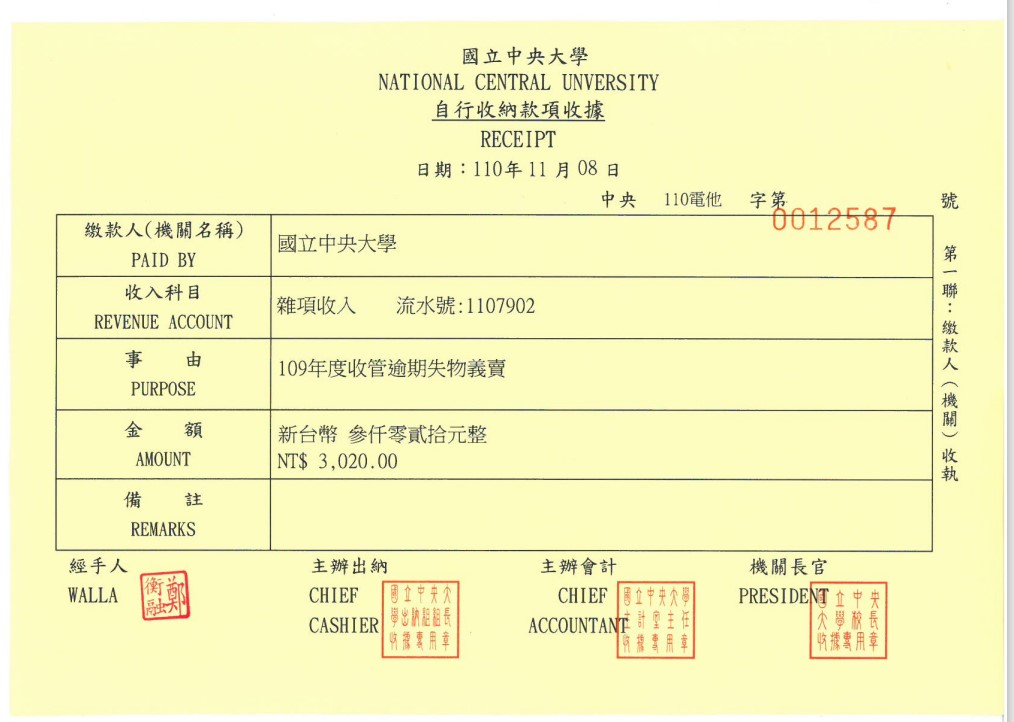 109年度遺失物義賣所得共計新台幣3020元整公告,已如數上繳校務基金