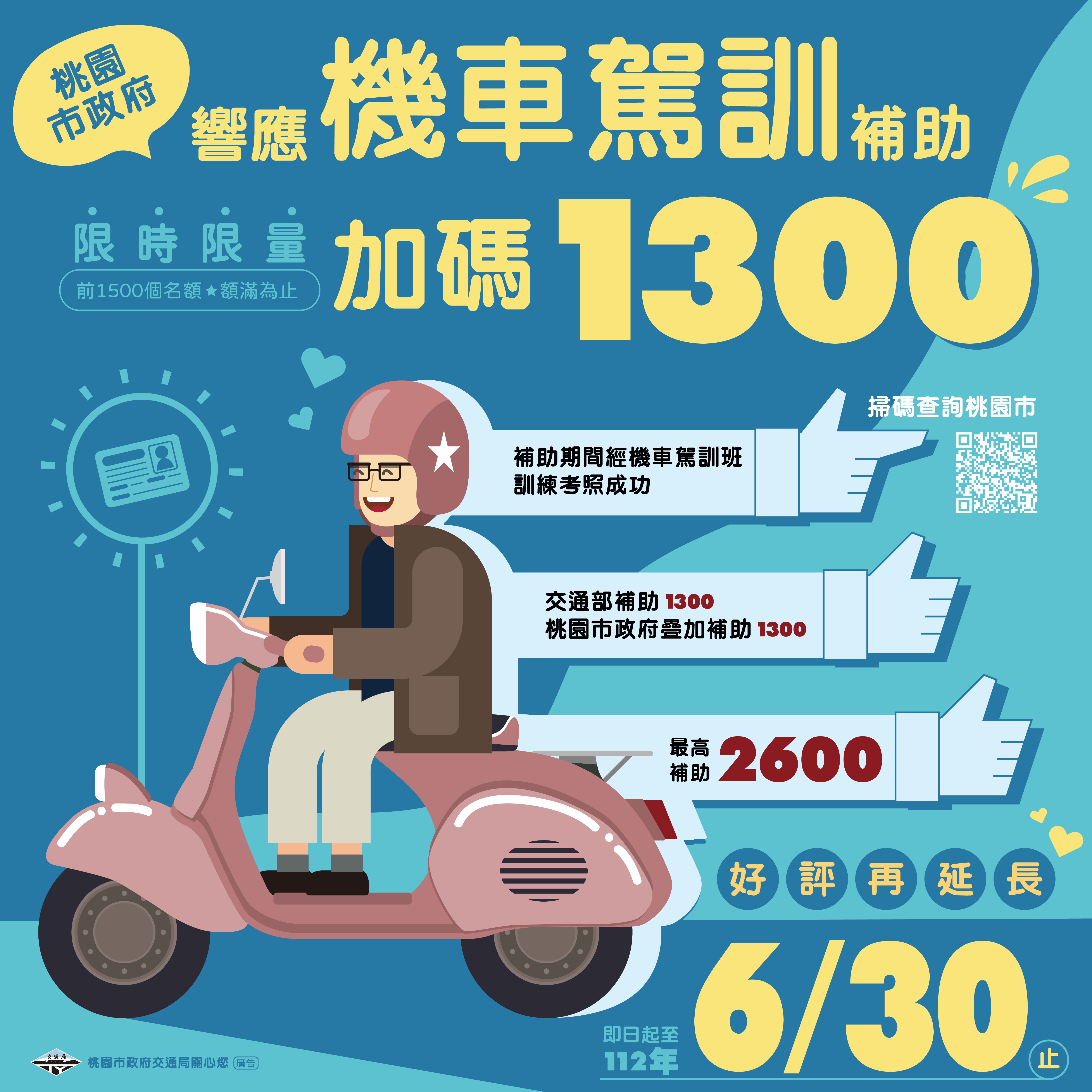 桃園市政府今年與交通部公路總局合作推出「機車駕訓疊加補助計畫」,參加機車駕訓班並成功考取駕照之民眾最高可獲訓練費補助2,600元,經推出後廣受民眾支持,為嘉惠更多市民朋友,市府宣布延長申請期限至今(112)年6月30日,呼籲準備考領機車駕照的民眾儘速報名。