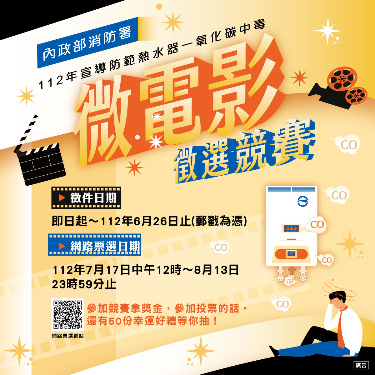 一、內政部消防署為強化民眾防範一氧化碳中毒知能,前有舉辦「112年宣導防範一氧化碳中毒微電影徵選」,計有50份作品參賽。