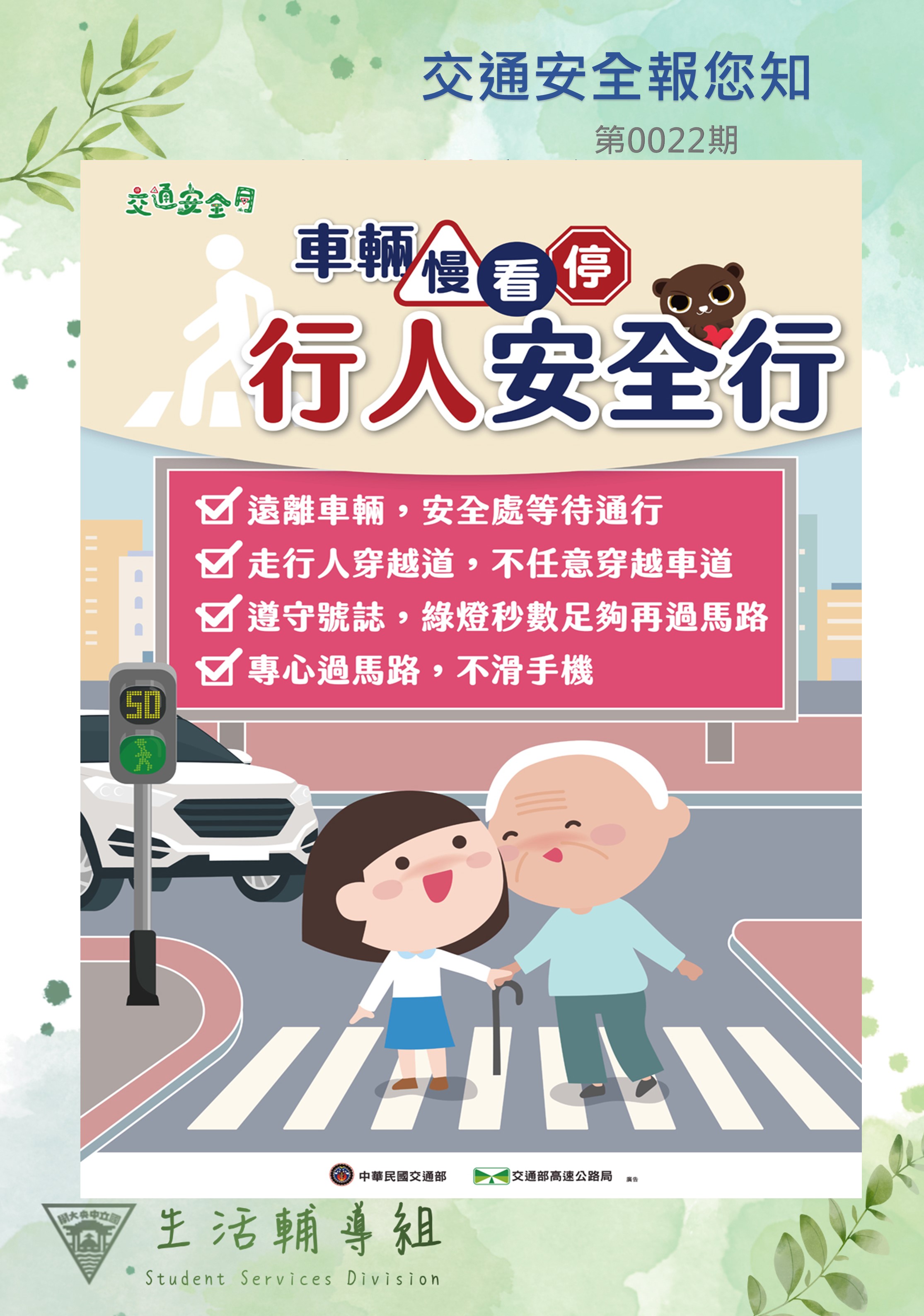112學年交通安全月宣導主題:「車輛慢看停,行人安全行」