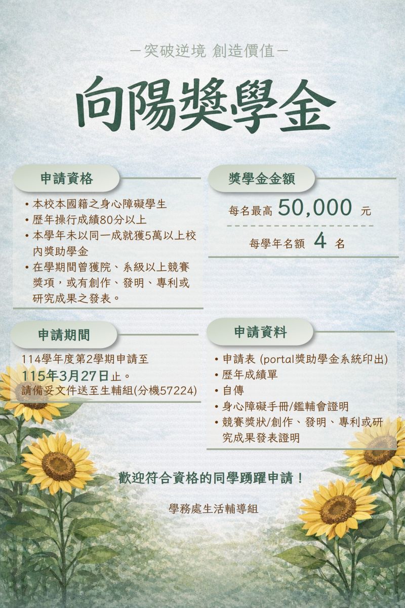 本校114學年度「向陽獎學金」即日起開放申請,申請期限至115年3月27日(星期五)止。