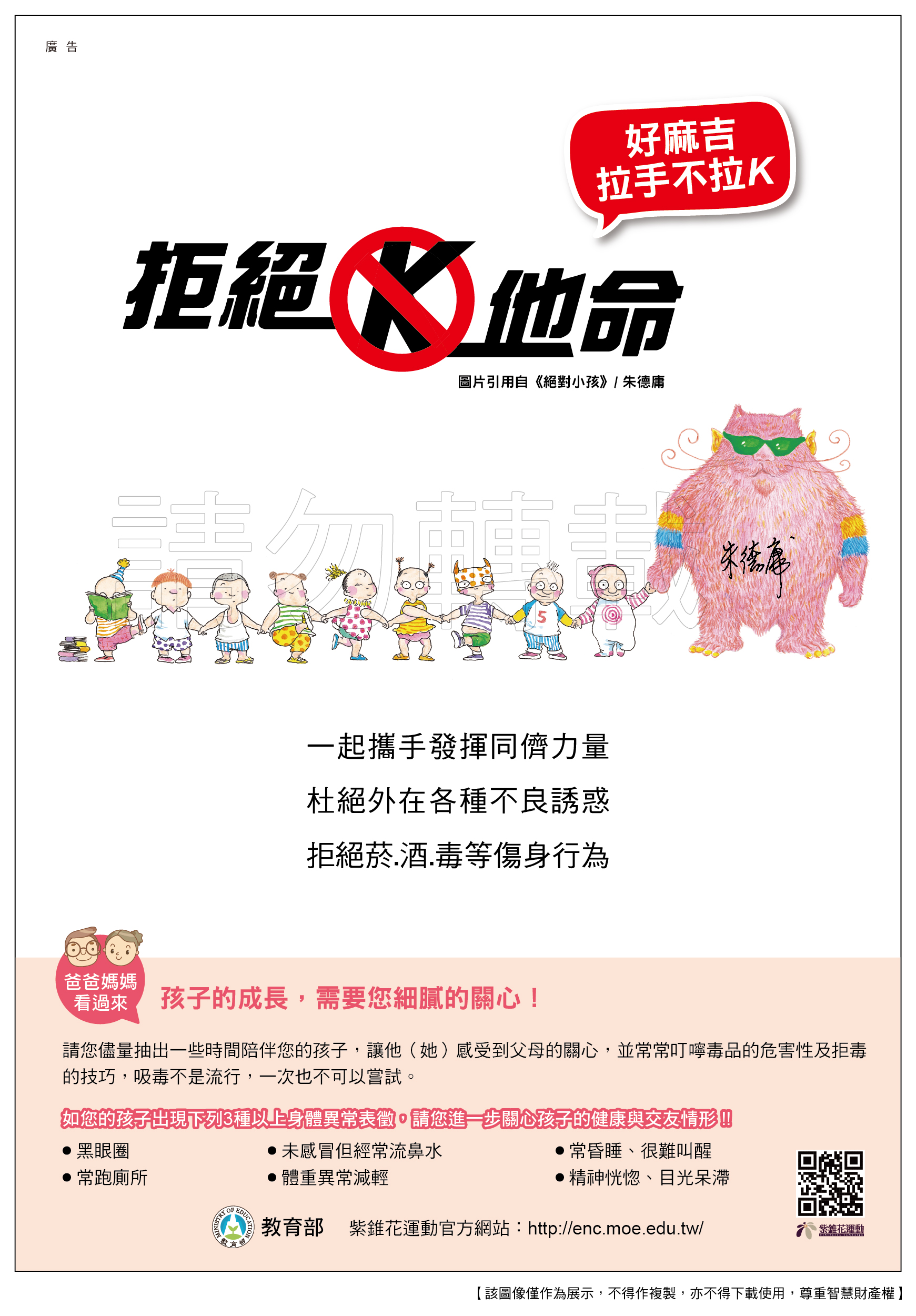 103年2月17日至2月28日為本校友善校園「紫錐花反毒宣導」週,本校將於學務處公佈欄(百花川步道)張貼反毒海報,並於行政大樓跑馬燈及宿舍電子公佈欄宣導反毒警語,另於2月24日至2月27日利用軍訓課實施課堂紫錐花反毒宣導,歡迎同學瀏覽及參加,拒毒反毒大家一起來。