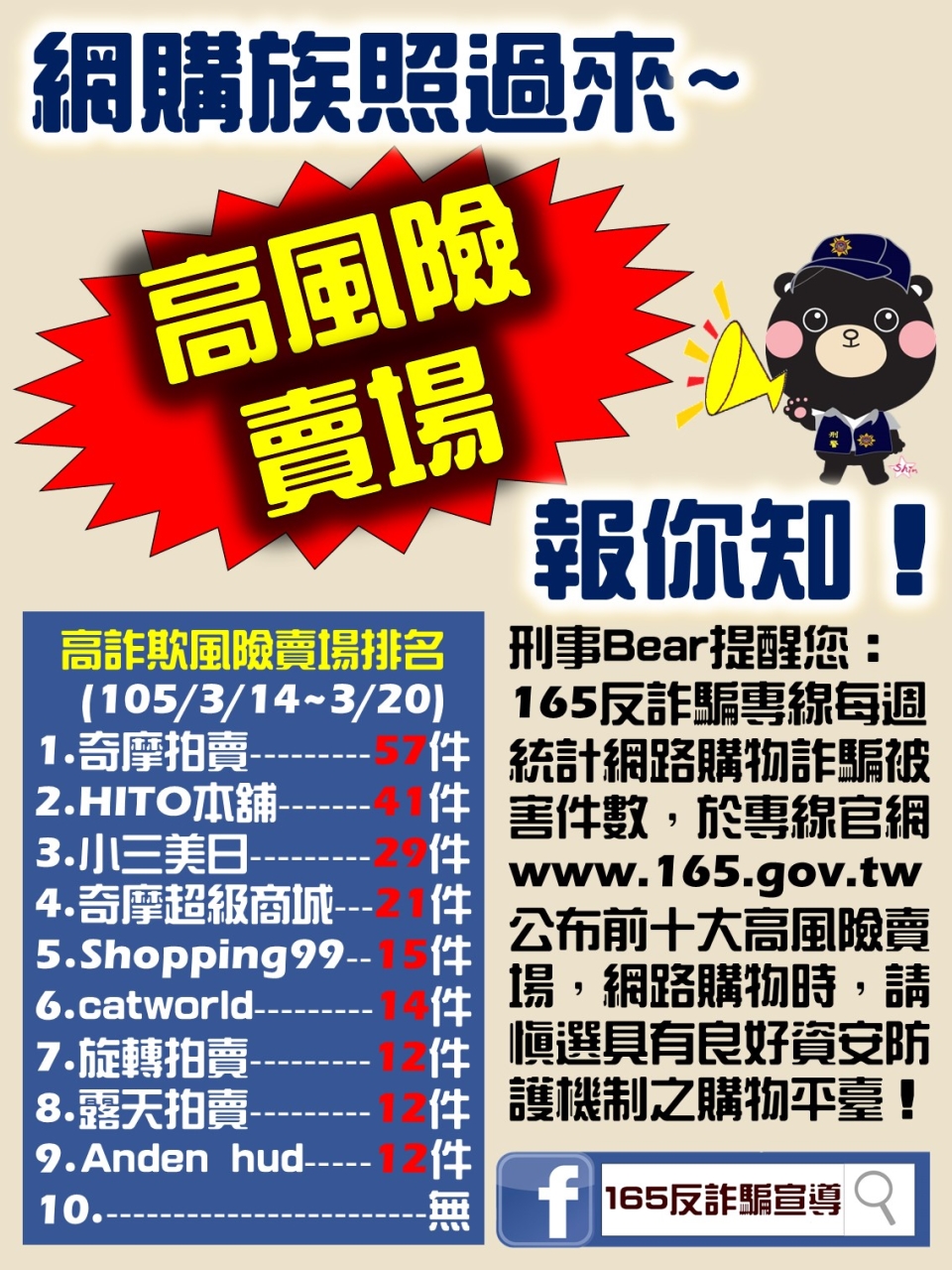 刑事警察局預防科統計,元旦迄今「ATM解除分期付款」始終占據各類詐騙被害案件首位,疑與購物網站會員個資外洩有關,3月份迄今「HITO本舖」疑似個資外洩詐騙案件已達134件,警方特別呼籲,165反詐騙諮詢專線網站每週均會公布高風險網路賣場名單,民眾上網購物應選擇信譽良好且具有完善資安防護機制之網路賣場,對於屢次勸告均未改善的網路賣場,也希望全民共同抵制避免使用,以保障自身財產安全。